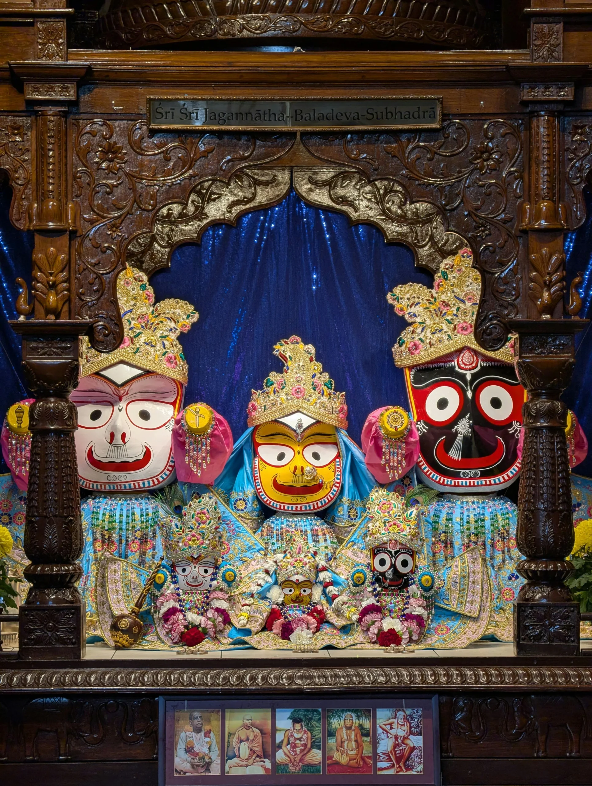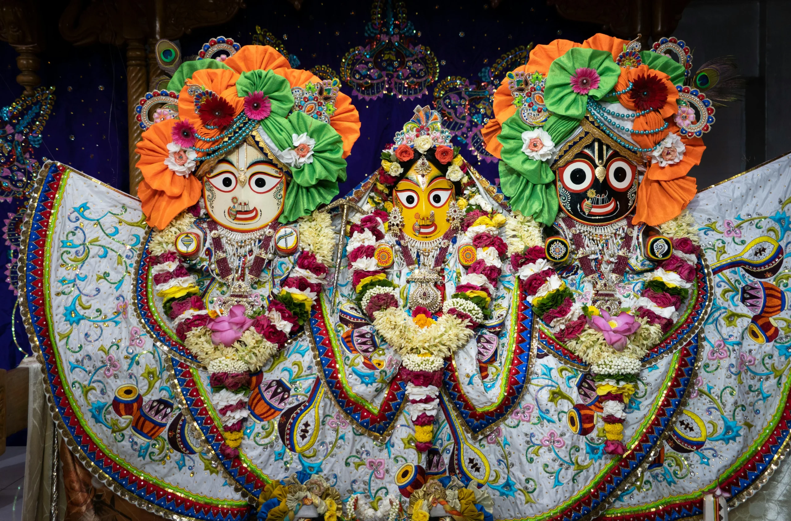 Lord Jagannath’s form is universal. His eyes are round and all-seeing—symbolizing no judgment. Skin is black (Jagannath), white (Balabhadra), and yellow (Subhadra)—symbolizing all races. His lack of limbs means He belongs to everyone and is beyond all forms.