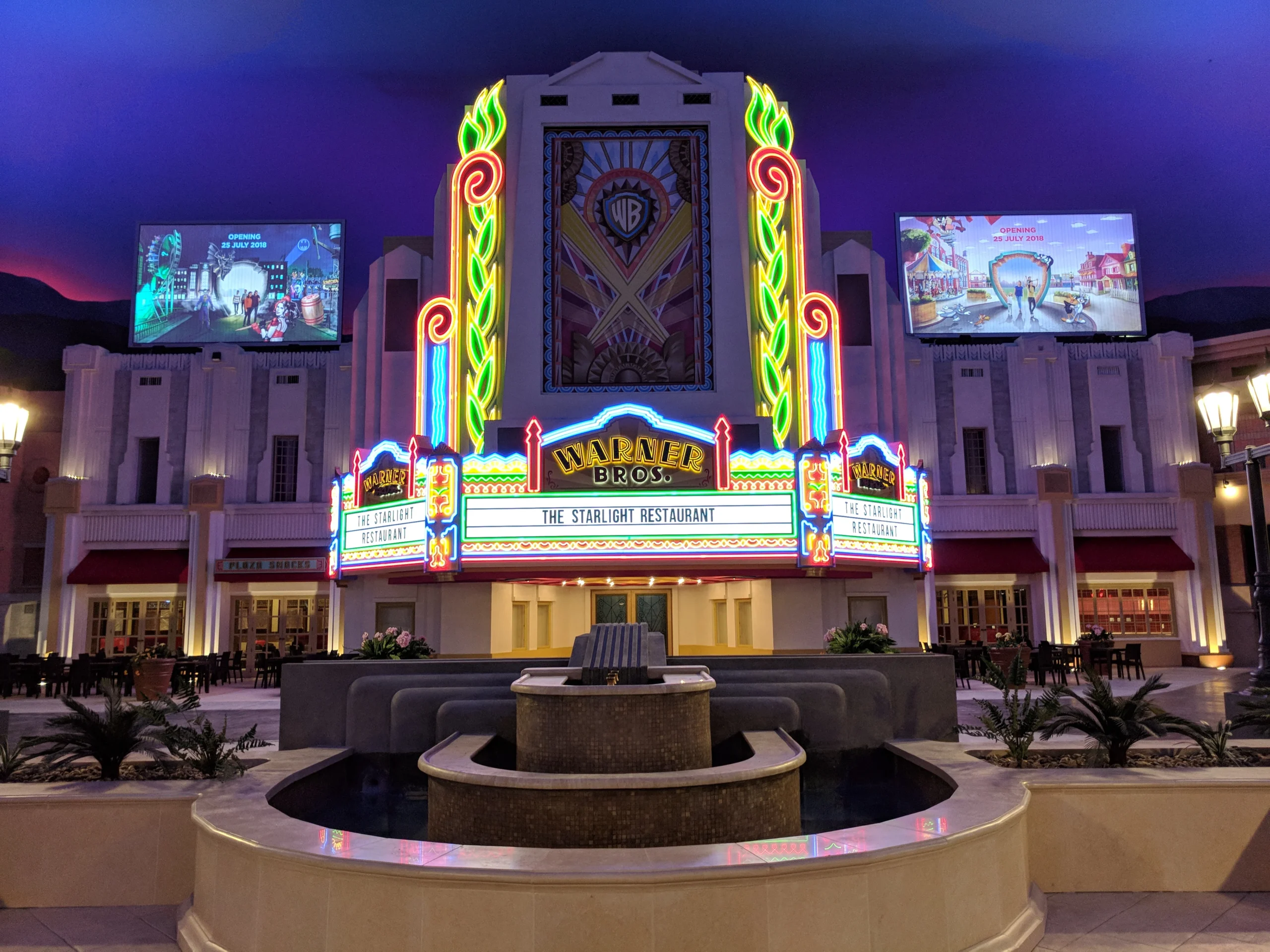 Start your journey here. The Plaza captures the spirit of 1930s Hollywood with elegant architecture, palm-lined boulevards, and vintage movie posters. Throughout the day, you can enjoy Cinematic Celebration, a spectacular light and sound show projected onto the walls, bringing Warner Bros. movies to life.